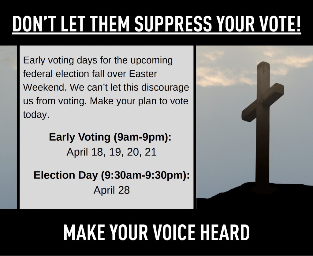 The upcoming federal election is being held on April 28 th and early voting days have been scheduled for April 18th, 19th, 20th, and 21 st. All four early voting days fall over Easter weekend, which has the potential of suppressing the Christian vote.